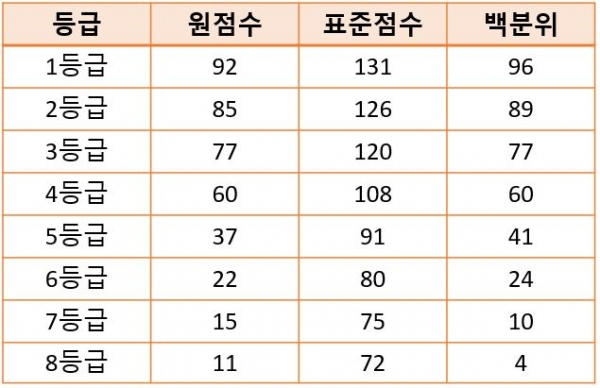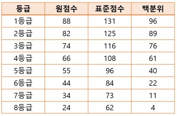 원점수 기준 등급 커트라인은 국어의 경우 1등급 88점, 2등급 82점, 3등급 74점으로 집계되었다. 수학은 가형의 경우 1등급 92점, 2등급 84점, 3등급 77점으로 확정되었고, 나형의 경우 1등급 92점, 2등급 85점, 3등급 77점으로 나타났다. 영어 영역의 경우, 1등급 비율이 12.66%로 절대평가 도입 이래 최대를 기록했다.
