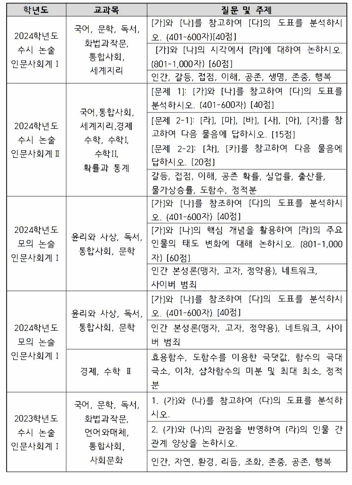 현대 사회의 윤리적 문제, 경제적 딜레마, 정책적 선택 등의 인문·사회적 문제. - 출제 경향: