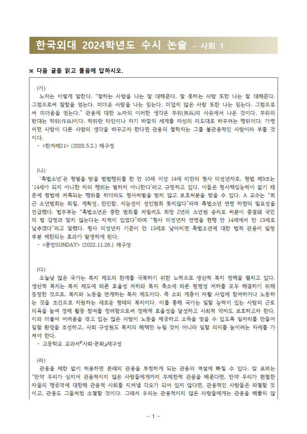 | 한국외대 2024학년도 논술 기출 인문 계열 1 (0) | 2024.12.28 |